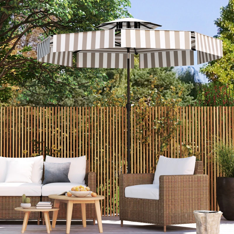 • - Keep Shaded: An 8.6 ft outdoor umbrella can keep friends and furniture cool by mounting to a hole in a patio dining table or stand-alone weighted base. The stylish striped design adds a touch of elegance