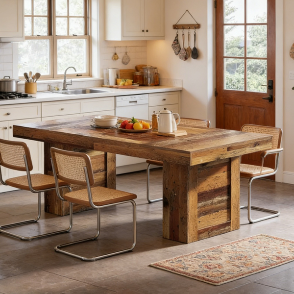 Unique Rustic Appeal - This large dining table stands out with its distinctive patchwork wood-grain finish. The planks add character and depth, fitting perfectly into farmhouse or industrial-style interiors. Its natural grain looks fantastic with leather chairs and iron accents.