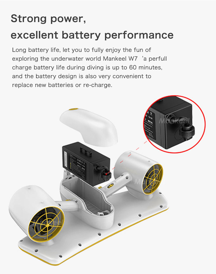 Featuring a removable 133.2Wh lithium battery, the W7 can operate for up to 60 minutes on a single charge. With a quick 3-hour charging time, it’s ready for multiple uses, making it ideal for extended underwater adventures.